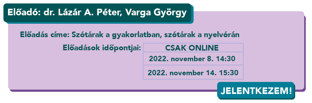 Az előadóról: a Károli Gáspár Református Egyetem, Bölcsészet- és Társadalomtudományi Kar, Anglisztika Intézet, Angol Nyelvészeti Tanszék oktatója, az Angol-magyar, magyar-angol tanulószótár és Angol-magyar, magyar-angol gyerekszótár szerzője..