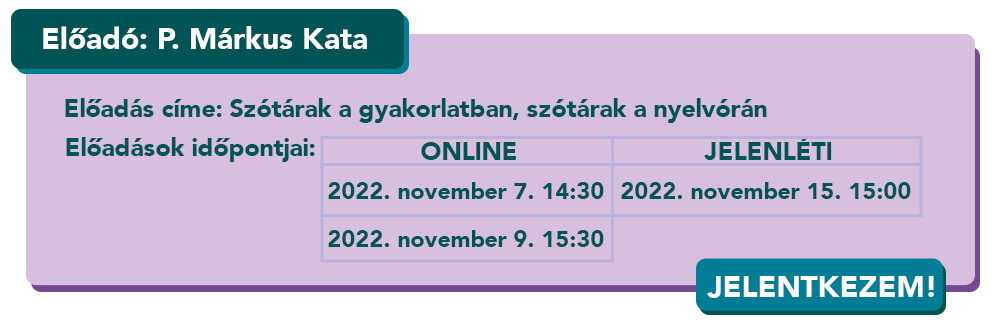 Kiadónk szótárbemutatóit ebben a tanévben is online továbbképzés formájában rendezzük meg a járványügyi helyzet miatt. Több előadónk többféle tematikában tart workshopokat az alábbi felbontásban és időpontokban. A szegedi jelenléti előadásra csak némettanárokat várunk, viszont a budapesti jelentléti és az online előadásokra bármilyen nyelvszakos tanárt sok szeretettel fogadunk. Jelentkezni itt tud az előadásokra: JELENTKEZEM!
